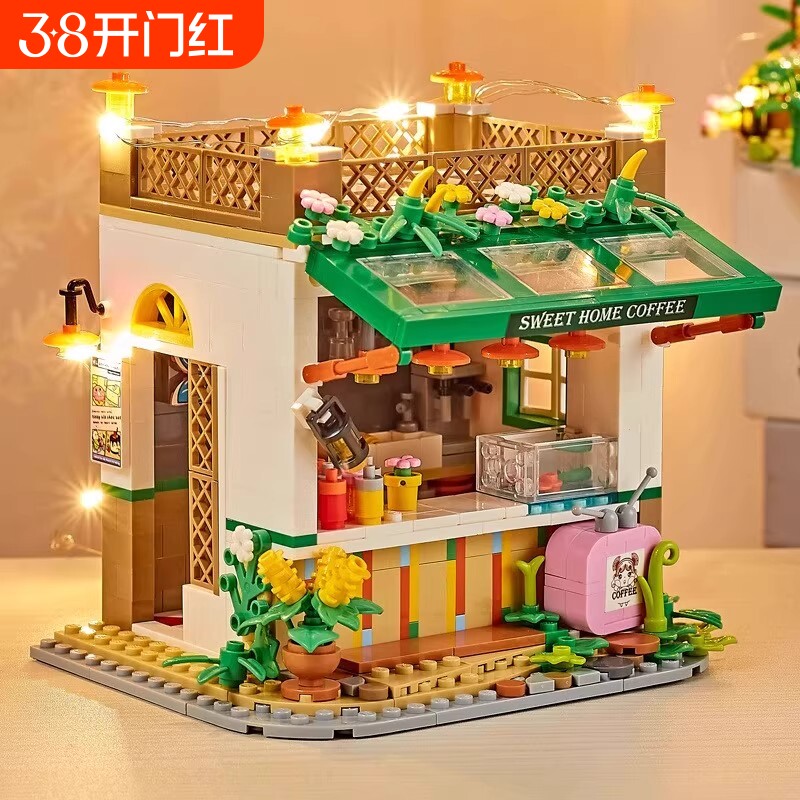 loz积木小颗粒拼装玩具益智 熊猫茶舍小熊咖啡折叠街景房子小屋