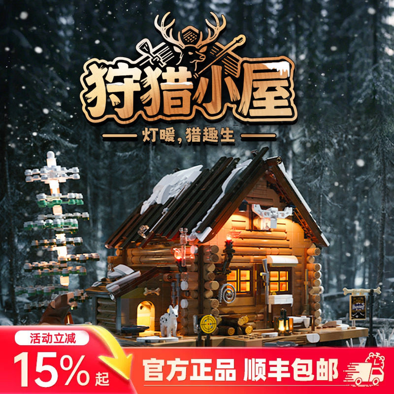 Funwhole复古房屋狩猎小屋灯光积木木屋别墅街景模型摆件拼装玩具