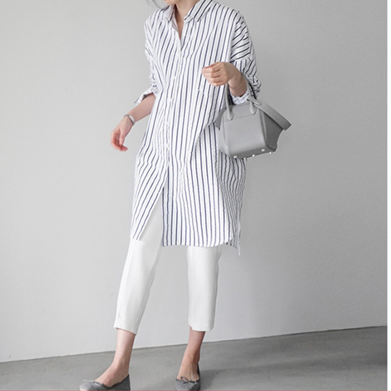 - 蓝色条纹衬衫女 中长款