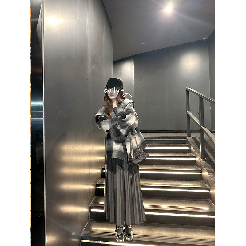 Romance Nanci 灰色格子拼接百褶裙秋冬假两件设计感半身裙短裙