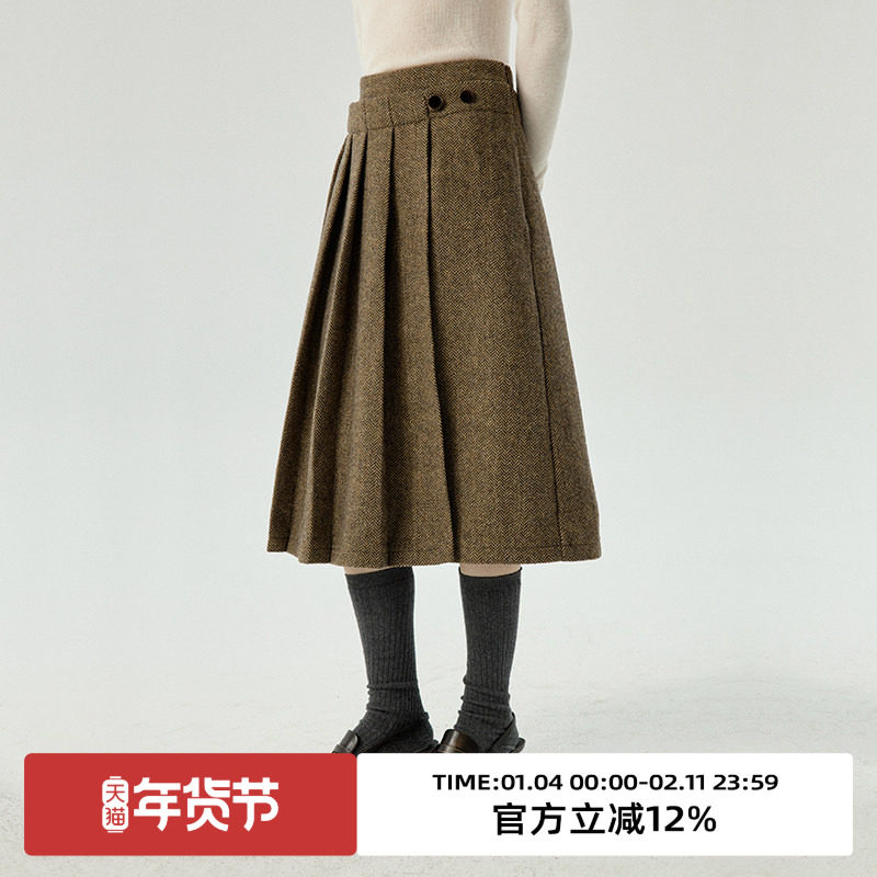 omont蛋挞家 复古羊毛百褶裙秋冬新款高腰显瘦中长款a字裙子