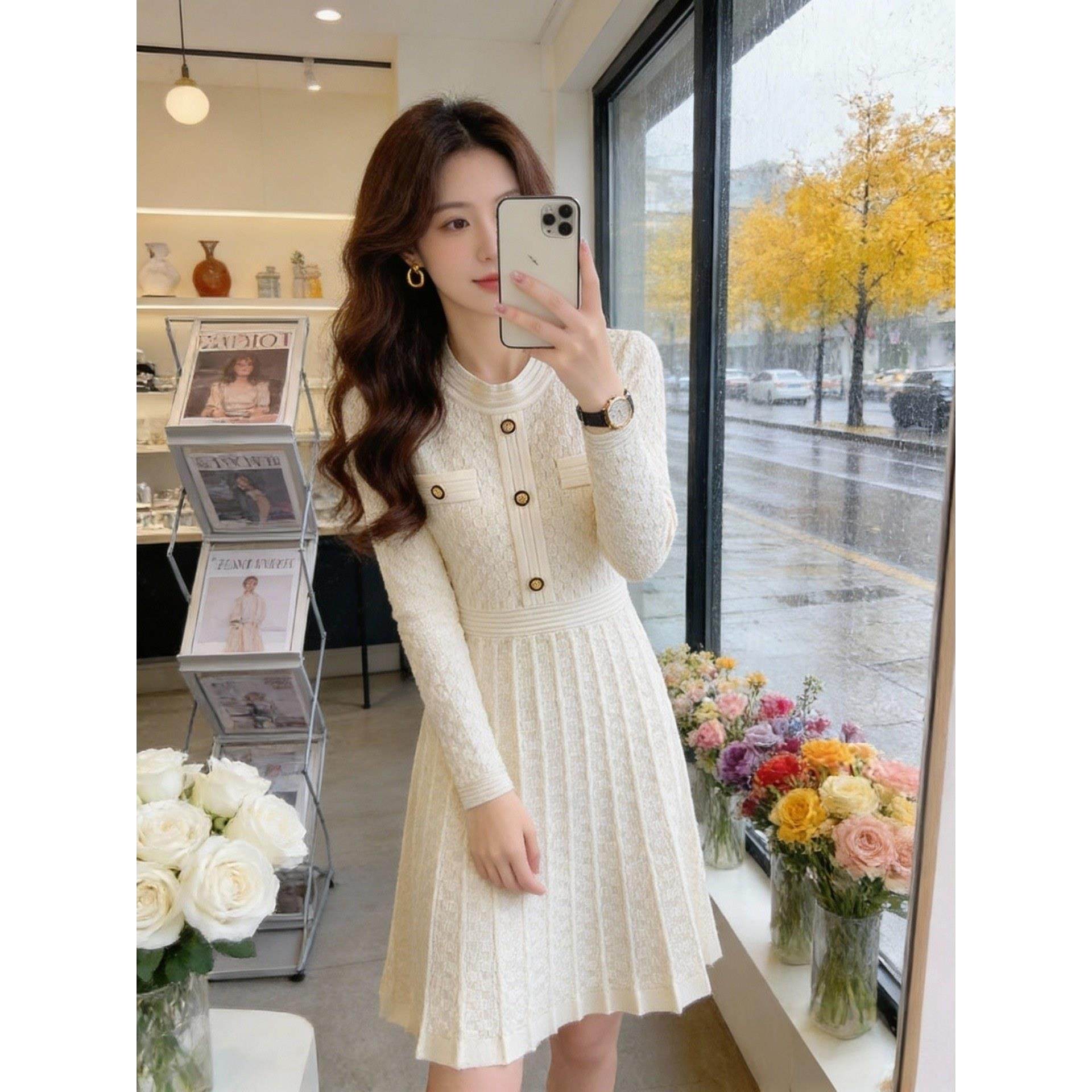 名媛小香风白色连衣裙收腰显瘦百褶裙秋冬千金感精致可外穿毛衣裙