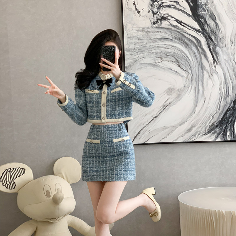 小香风毛呢时尚套装裙女秋冬季新款小个子短外套半身裙两件套洋气