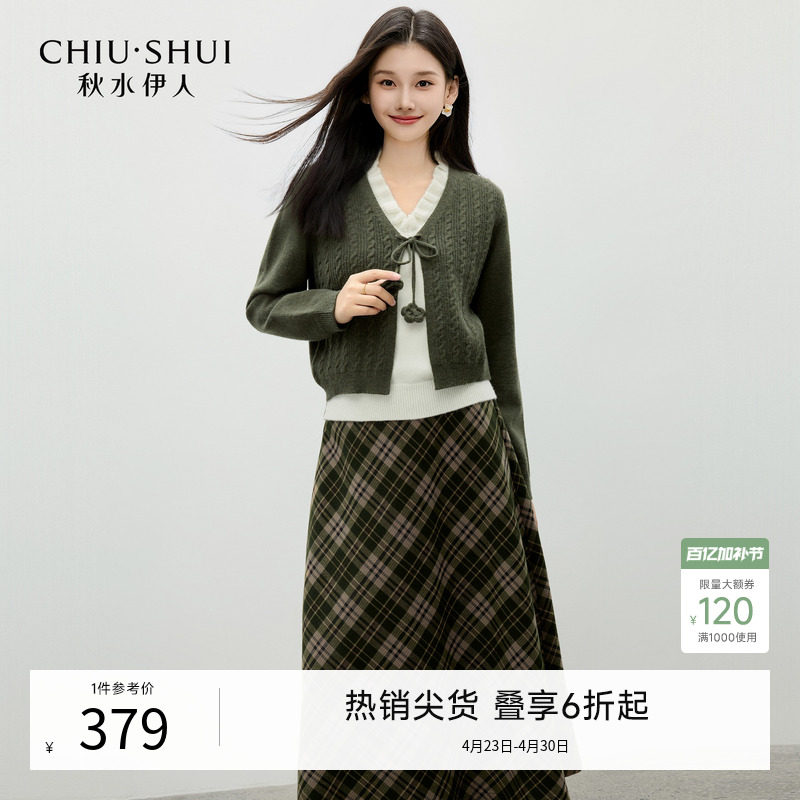 秋水伊人时尚套装2025年冬季新款女装文艺格子通勤毛衫半裙两件套