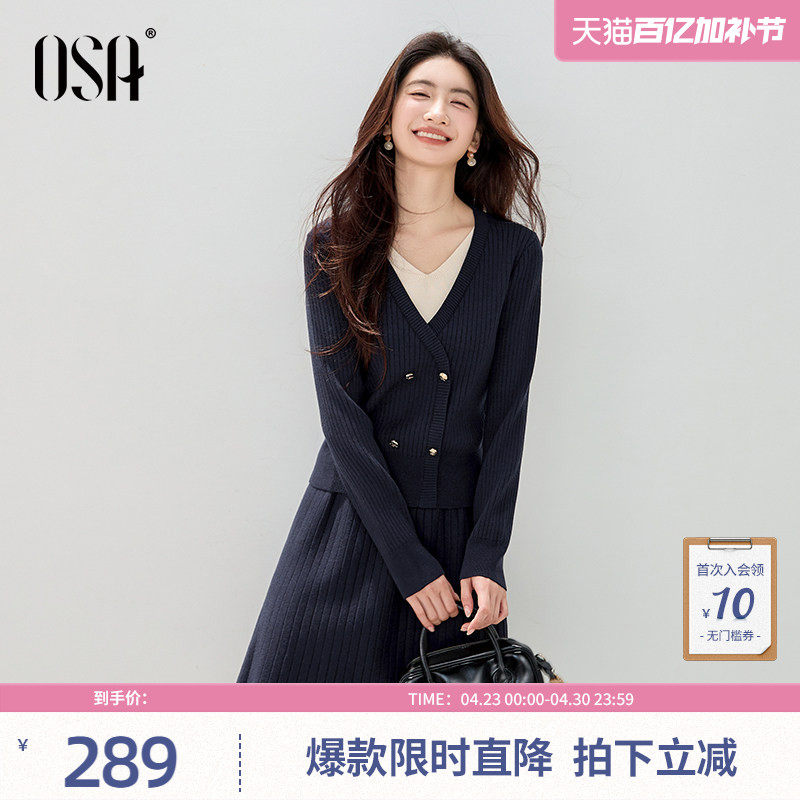OSA欧莎撞色V领假两件针织套装女装冬季新款毛衫半裙两件套内搭裙