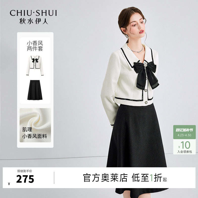 高级感套装裙女秋冬新款小香风蝴蝶结木耳边立领粗花呢外套两件套