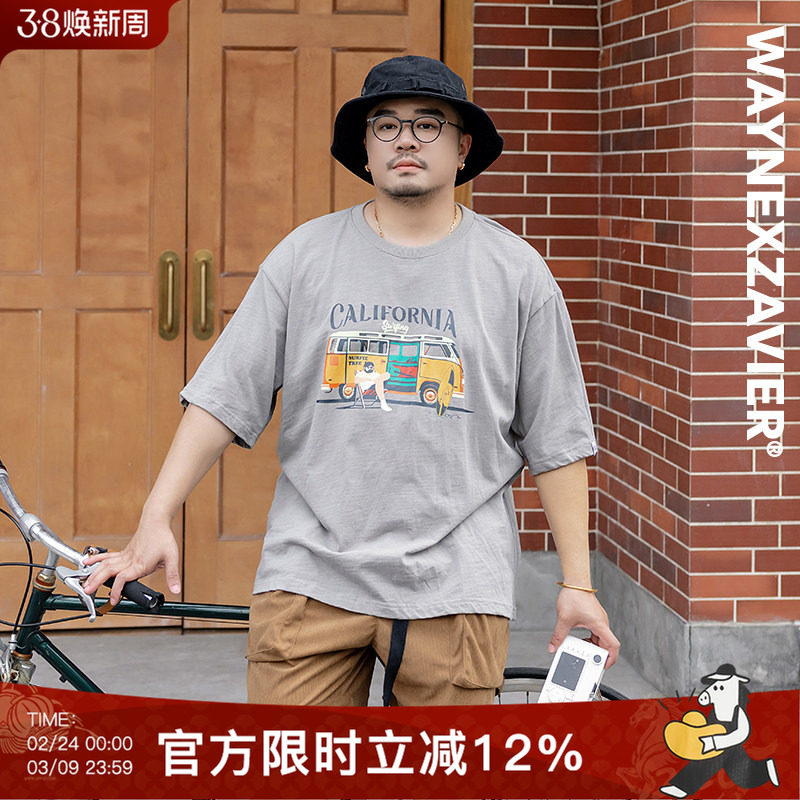 韦恩泽维尔加肥加大宽松大码男夏圆领休闲印花薄款竹节棉T恤9217