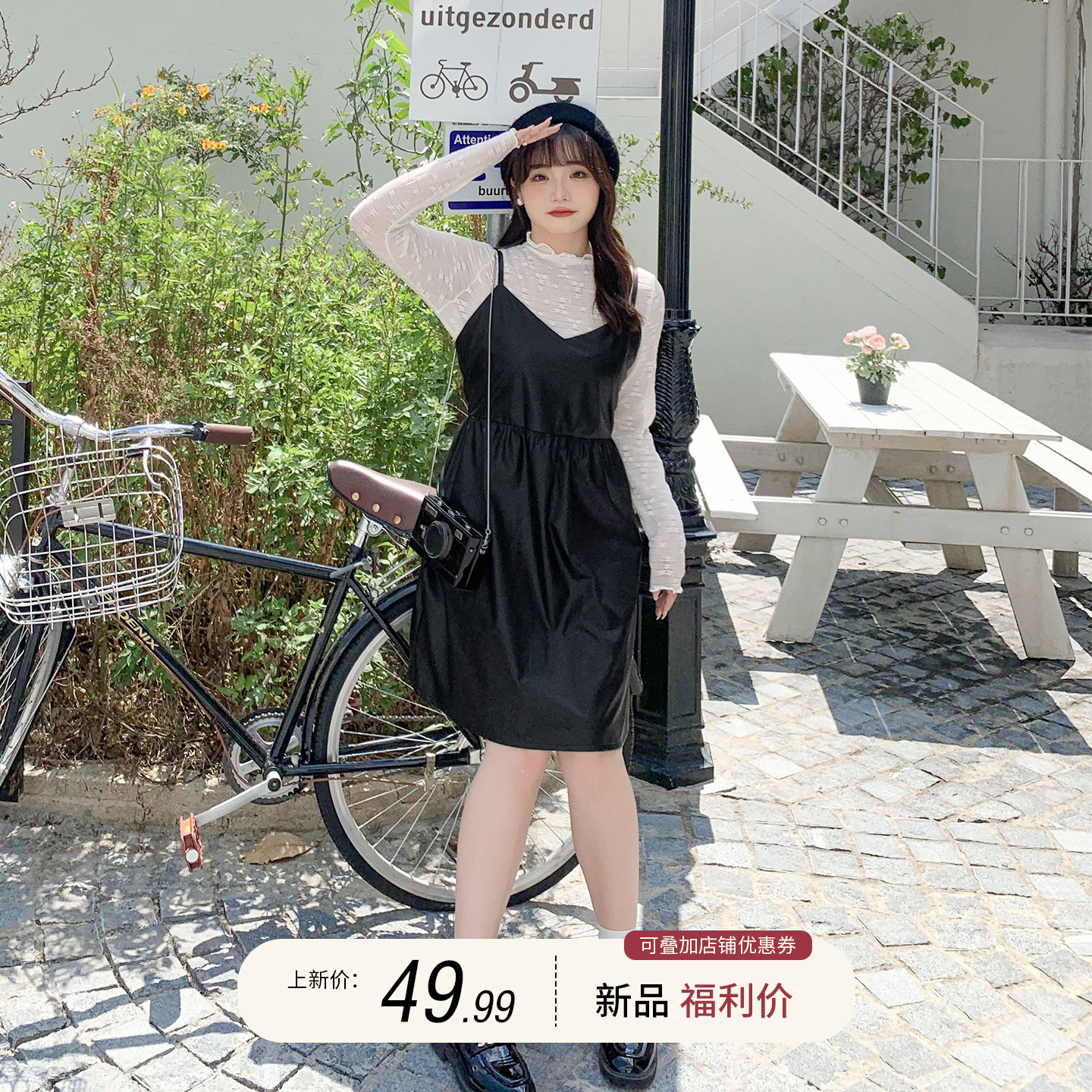 大码女装法式高级感连衣裙冬季假两件吊带皮裙胖MM遮肚子显瘦裙子