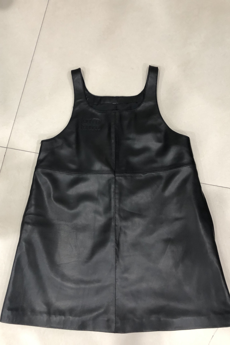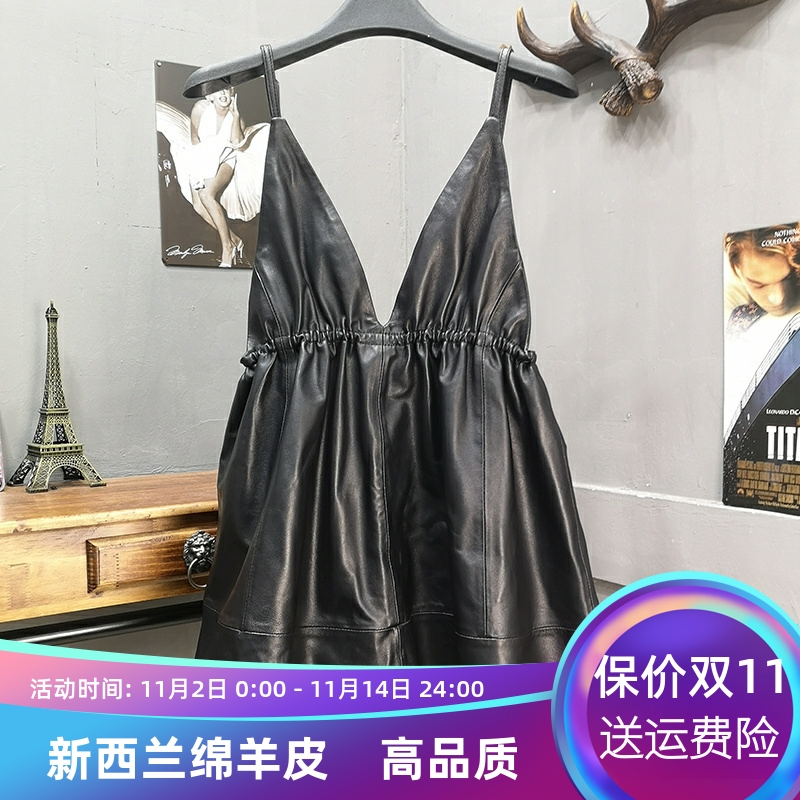 连衣裙女25秋季新款绵羊皮黑色吊带皮裙真皮无袖背带裙无袖中长裙