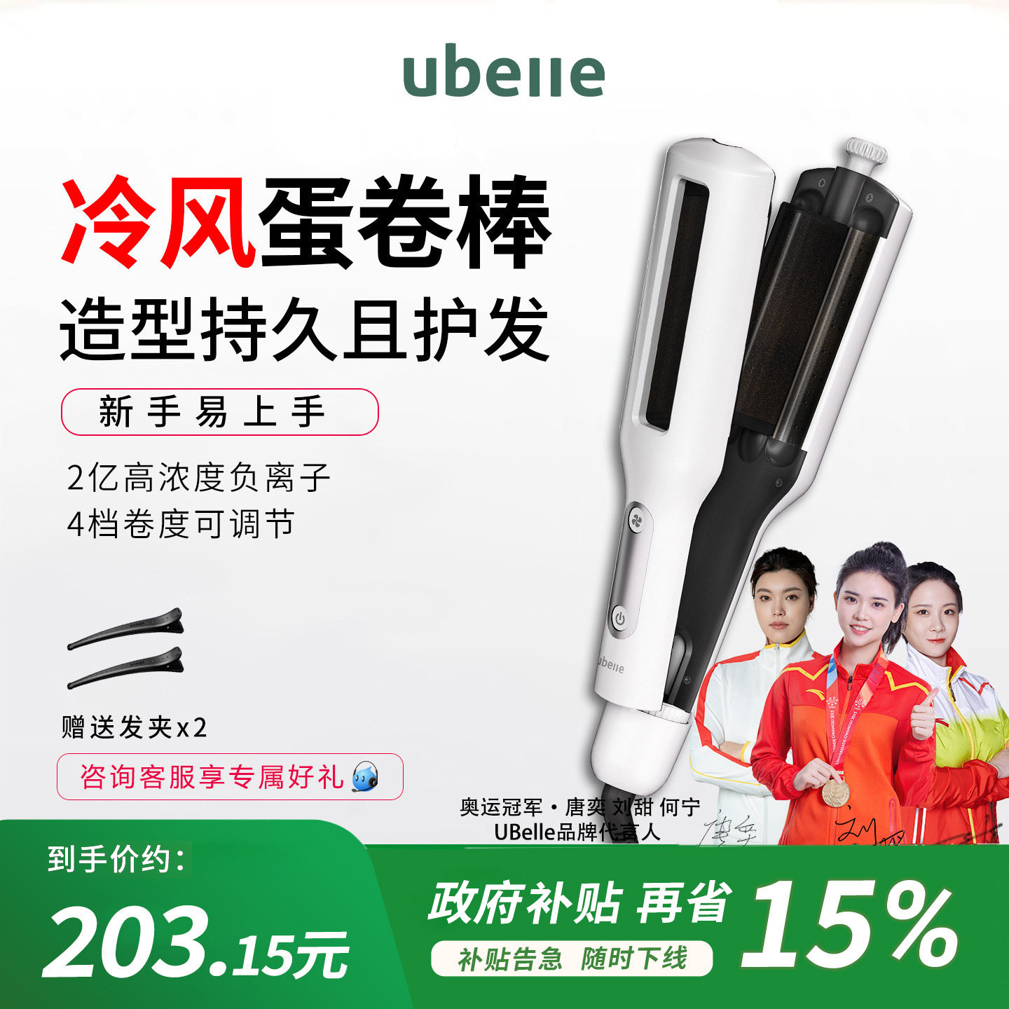 UBelle冷风蛋卷头卷发棒32mm36三管水波纹深U大卷40mm负离子夹板