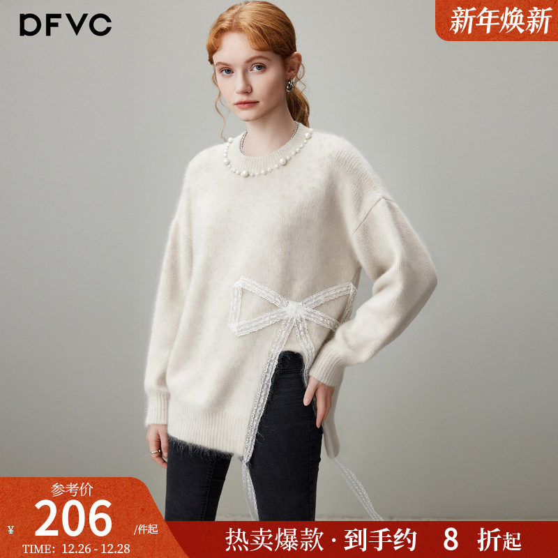 dfvc米色慵懒风圆领毛衣女2025年冬季新款设计感开叉宽松针织衫厚