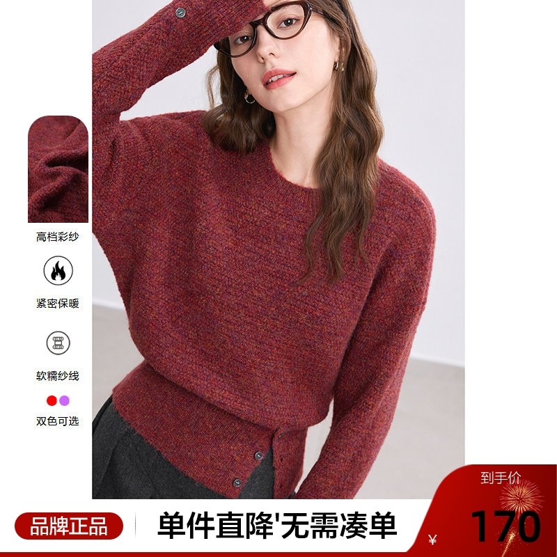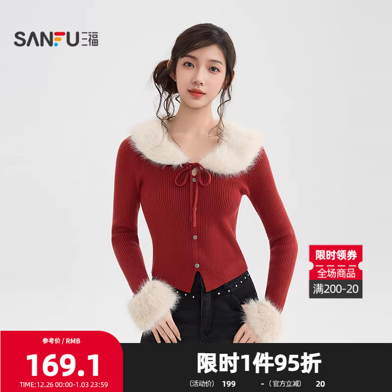 三福圆领毛衣2025冬季可拆毛领开叉摆毛针织衫上衣女装513684