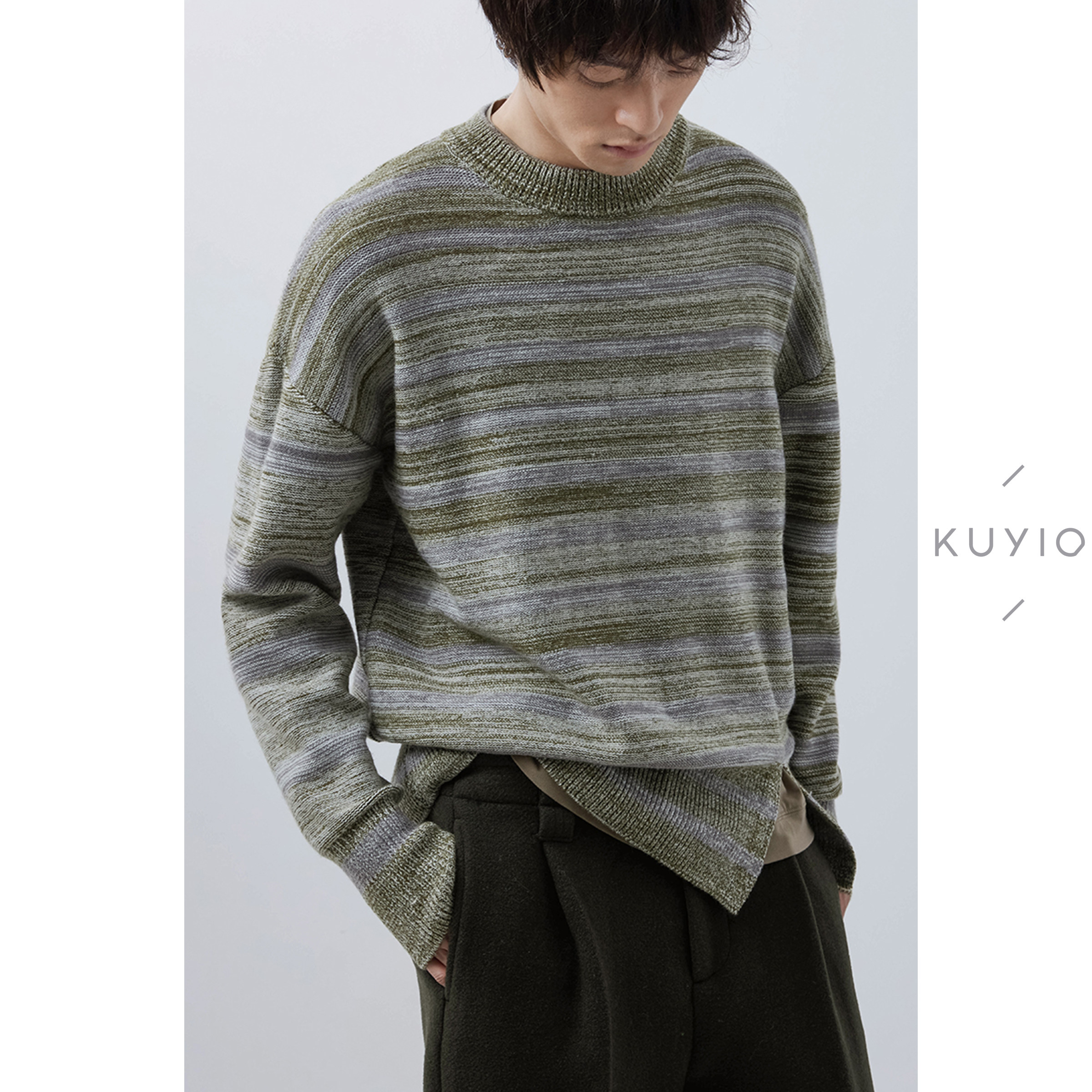 KUYIOU/设计师款 渐变条纹下摆开叉落肩圆领羊毛针织加厚毛衣男