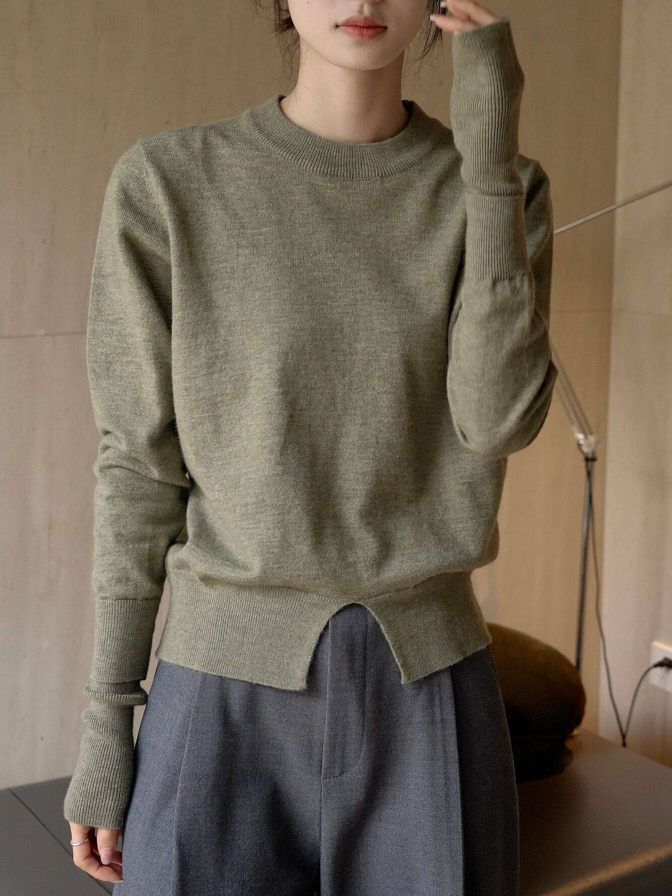 Maven Lin素雅舒适 100%羊毛圆领叠袖毛衣女设计感开叉针织衫上衣