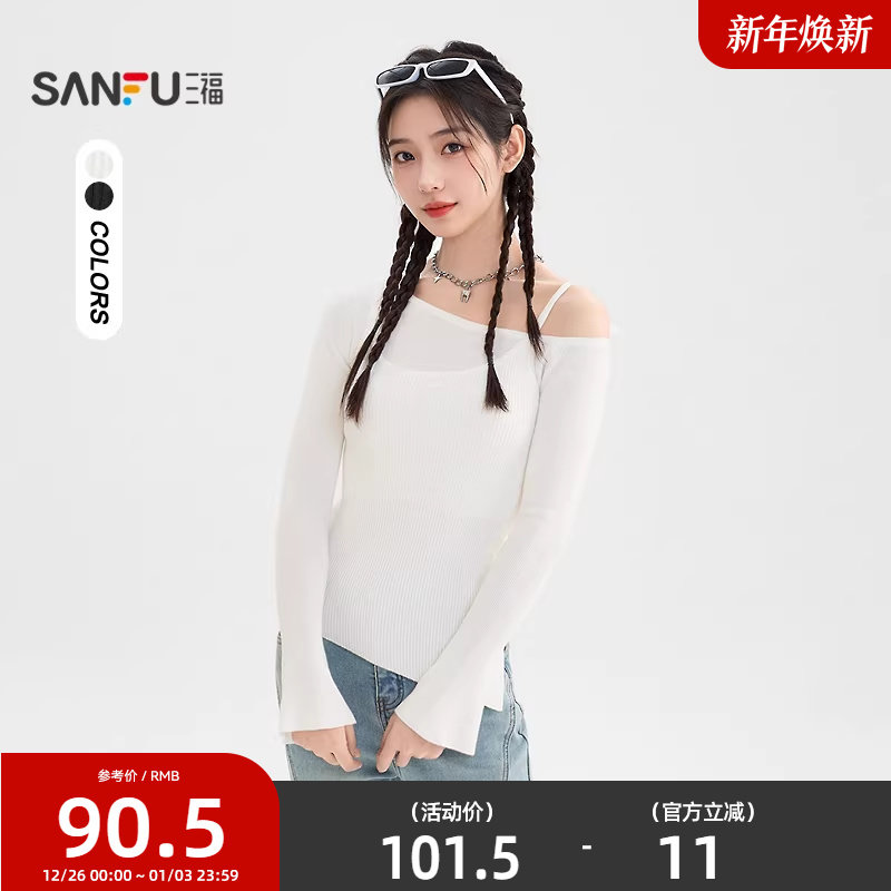 三福毛衣2025新款冬季斜开叉针织衫吊带斜肩假两件上衣女装511633