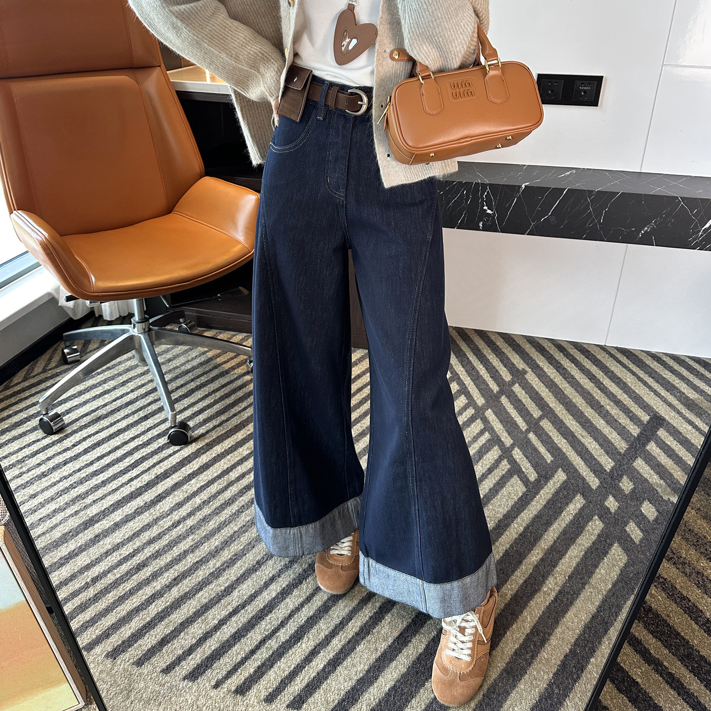 - 阔腿裤女 牛仔 翻边