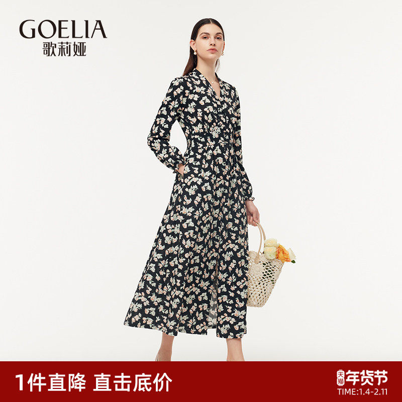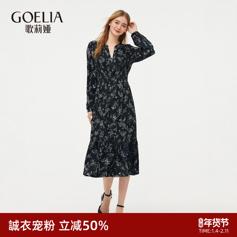 - 秋季长袖碎花连衣裙长款