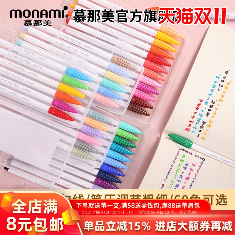 慕那美旗舰店新60色纤维笔P3000韩国monami水彩笔套装黑色水性笔0.5勾线记号手账笔彩色做笔记用慕娜美04009