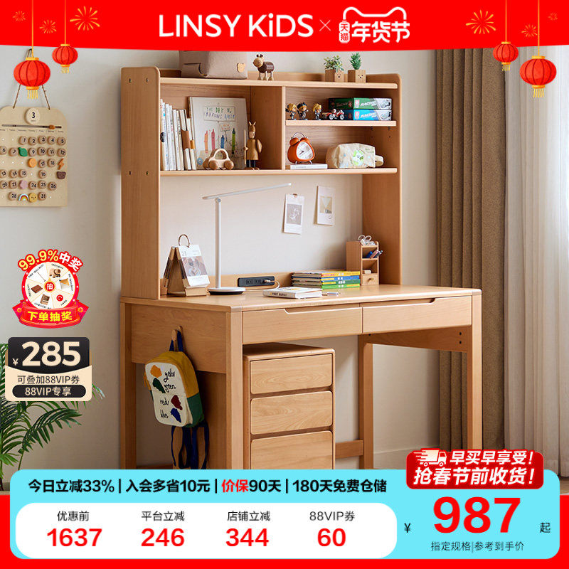 林氏儿童书桌学生家用实木学习桌椅可升降儿童写字桌书柜一体木业