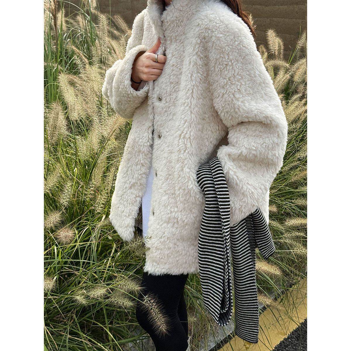 韩系100%羊毛中长款立领牛角扣羊剪绒羊羔毛外套女冬皮毛一体大衣