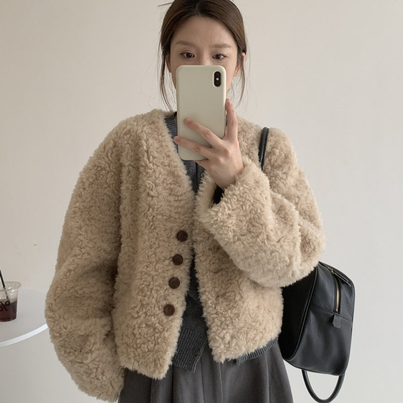 100绵羊羔毛韩版2025冬季新款羊剪绒皮毛一体皮草外套女v领短款