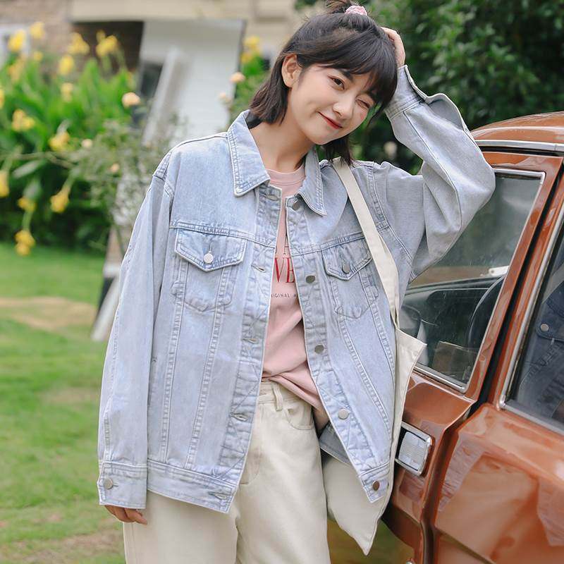 2022年春季新款韩版宽松百搭长袖浅色女学生夹克牛仔外套上衣单件