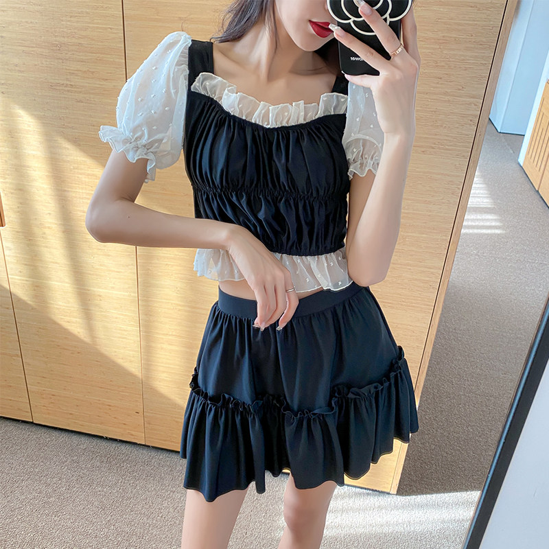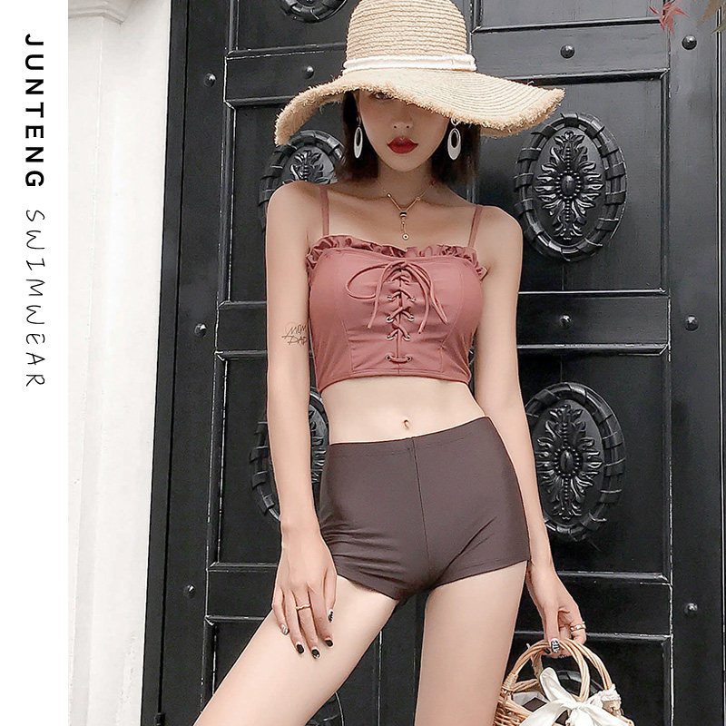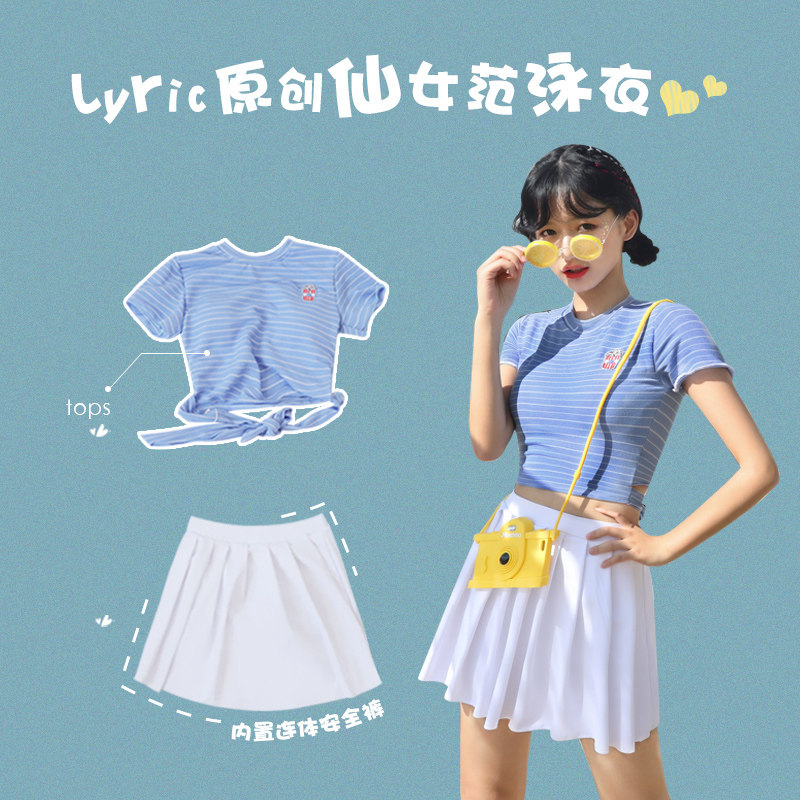 韩国ins风分体平角裙式泳衣女清新学生保守遮肚显瘦度假温泉泳装