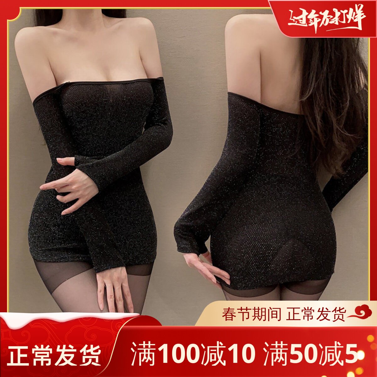性感包臂裙亮丝一字肩秘书ol诱惑紧身低胸夜店女王抹胸露肩超短裙