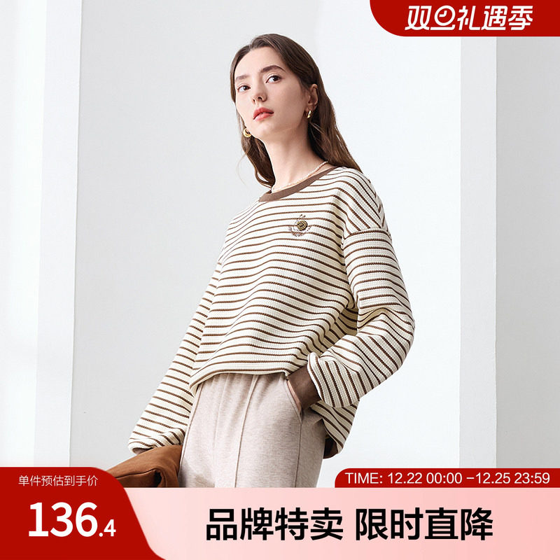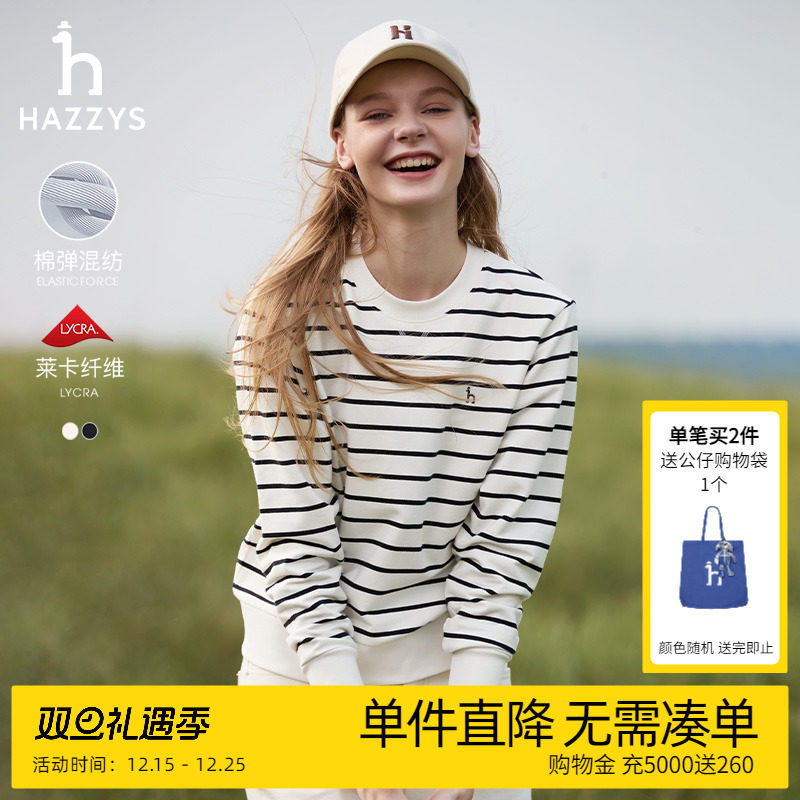 Hazzys哈吉斯圆领条纹卫衣女士早秋套头休闲通勤长袖T恤宽松上衣