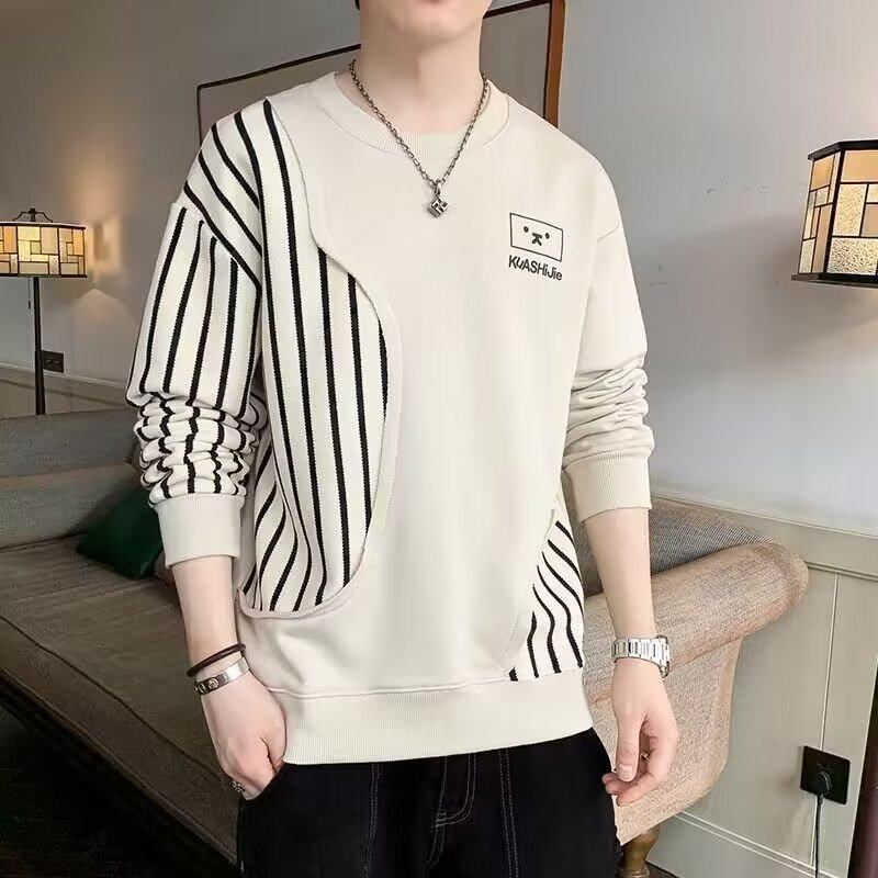 秋冬新款潮流简约条纹卫衣男士圆领套头休闲上衣时尚百搭加绒打底