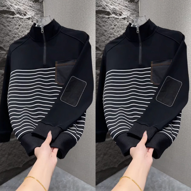 2025秋冬季新款时尚百搭潮流条纹卫衣男士立领半拉链加绒加厚上衣