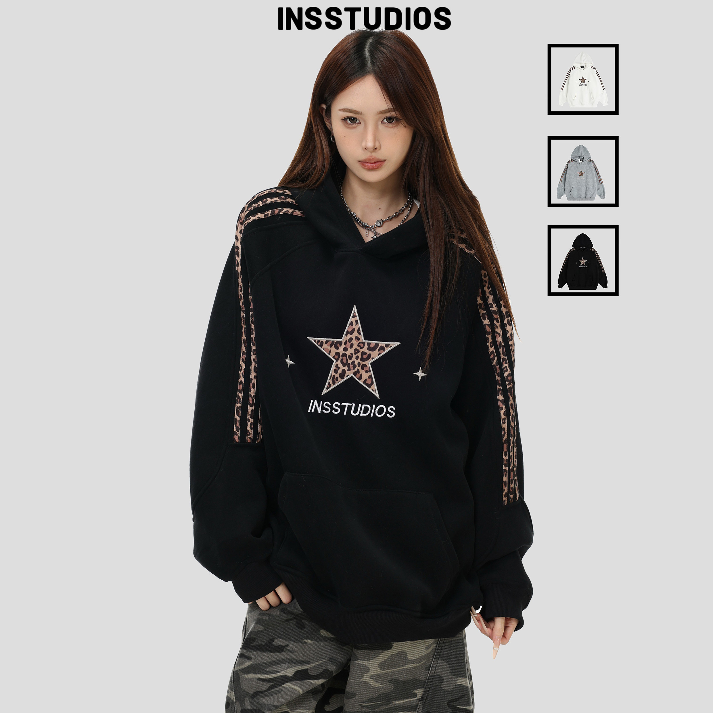 INSstudios 国潮牌美式复古「豹纹插肩条纹卫衣」宽松加绒连帽衫