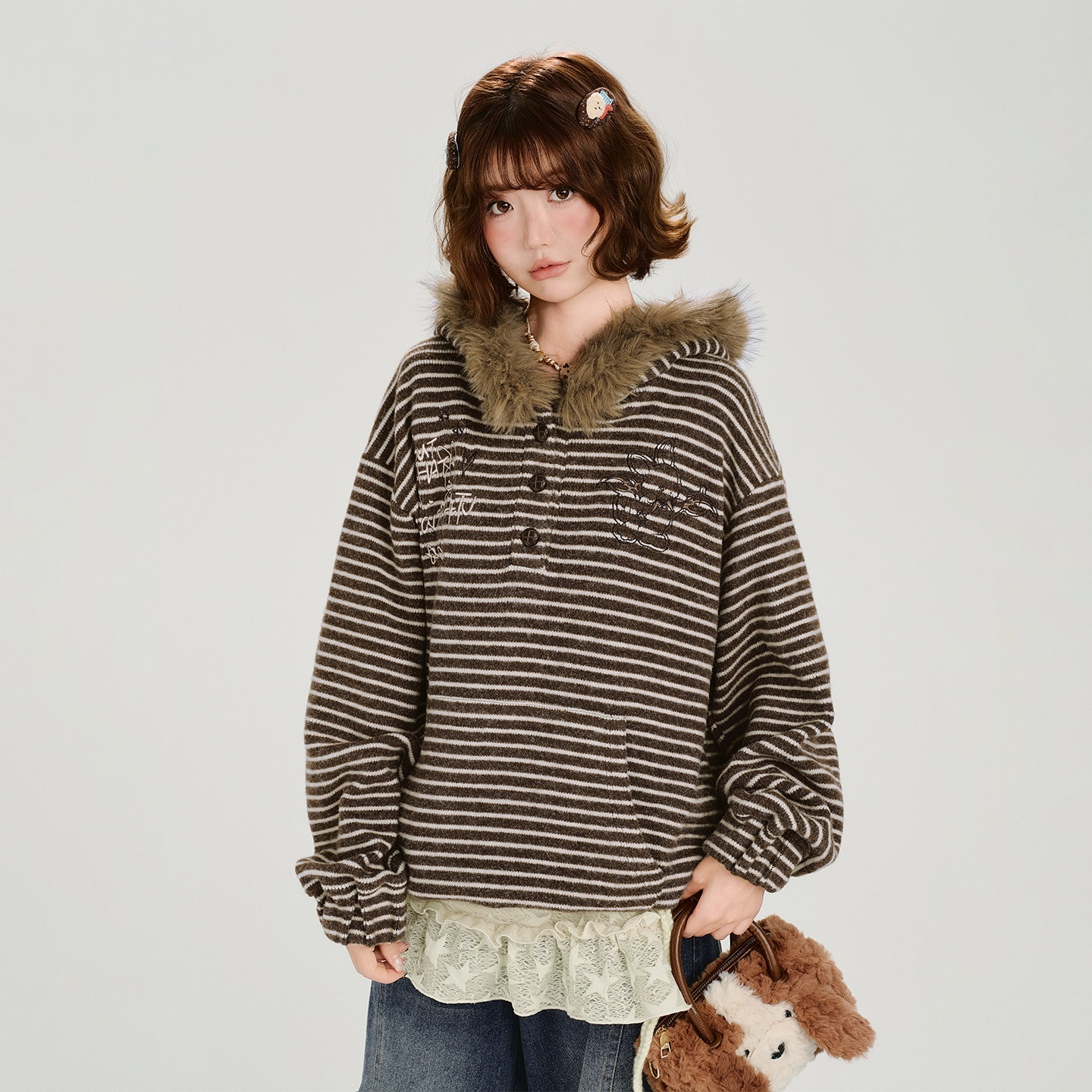 Girlyhalo美式复古刺绣毛领连帽绒感条纹卫衣女秋冬新款宽松上衣