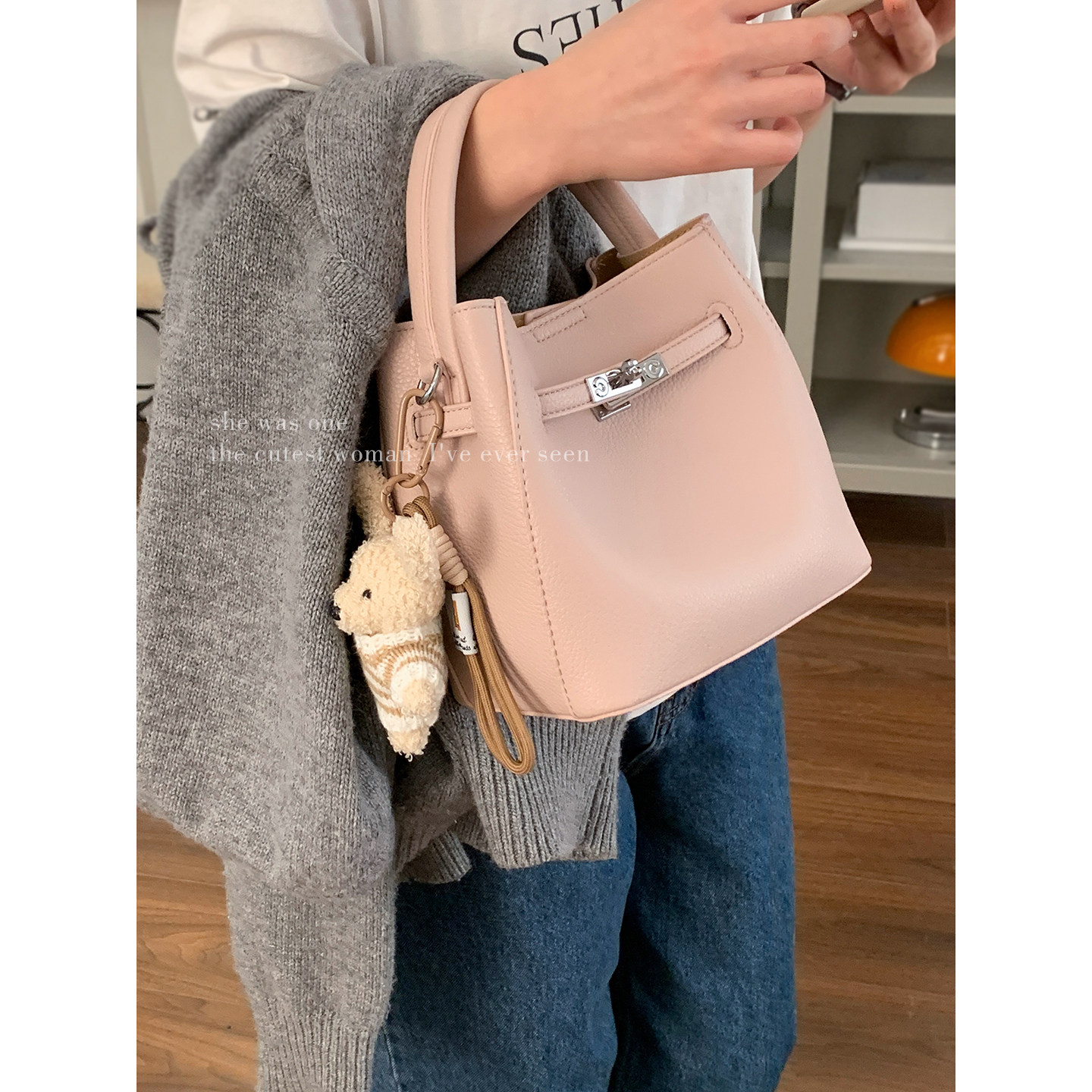 韩国新品自制软皮水桶包菜篮子小手提包甜美高级感休闲单肩斜挎包