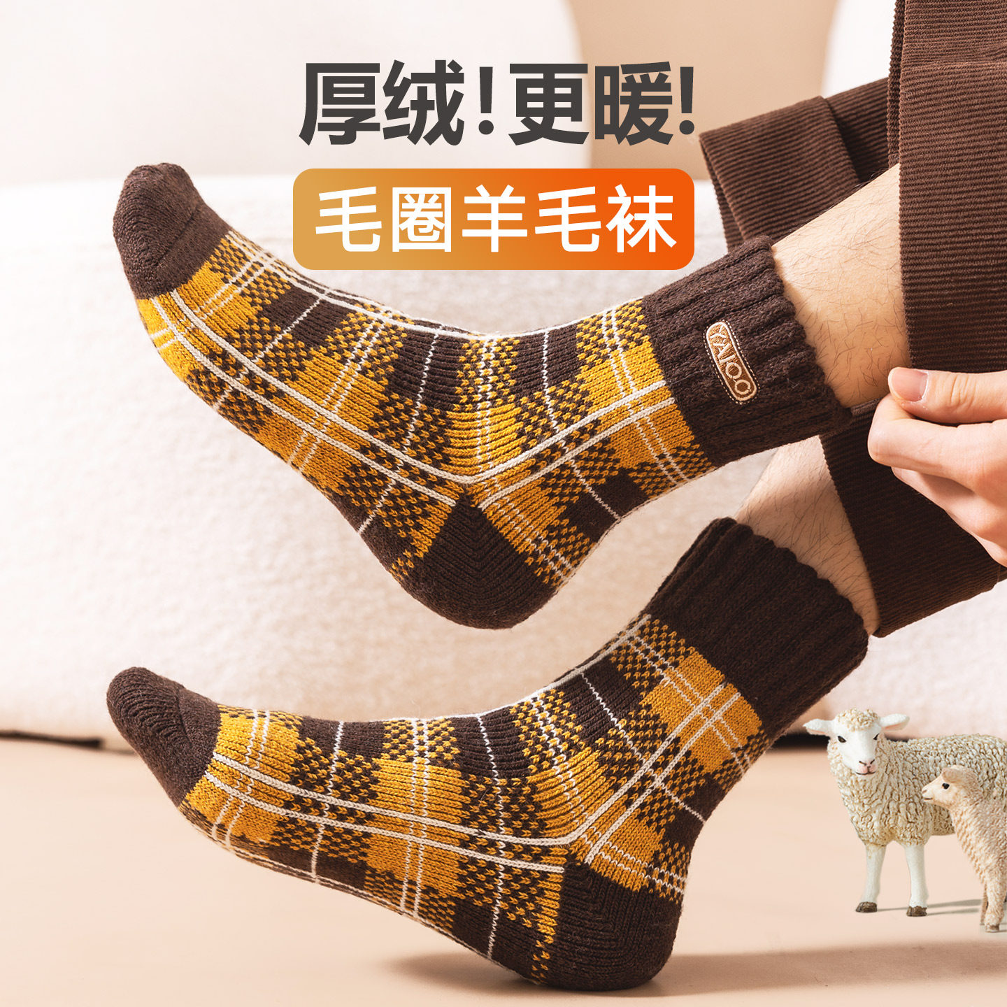 真羊毛袜男冬季加厚保暖中筒袜复古格子厚羊毛袜毛圈袜加绒时尚袜