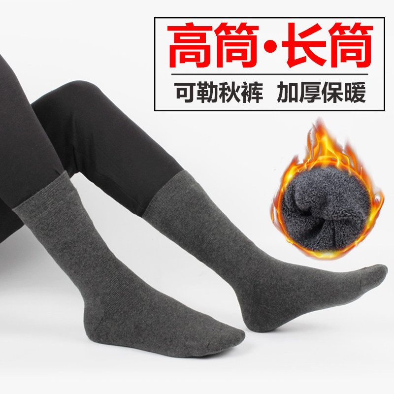 加厚长筒袜男冬季长袜加绒保暖袜子男毛巾袜纯棉男士高筒棉袜黑色