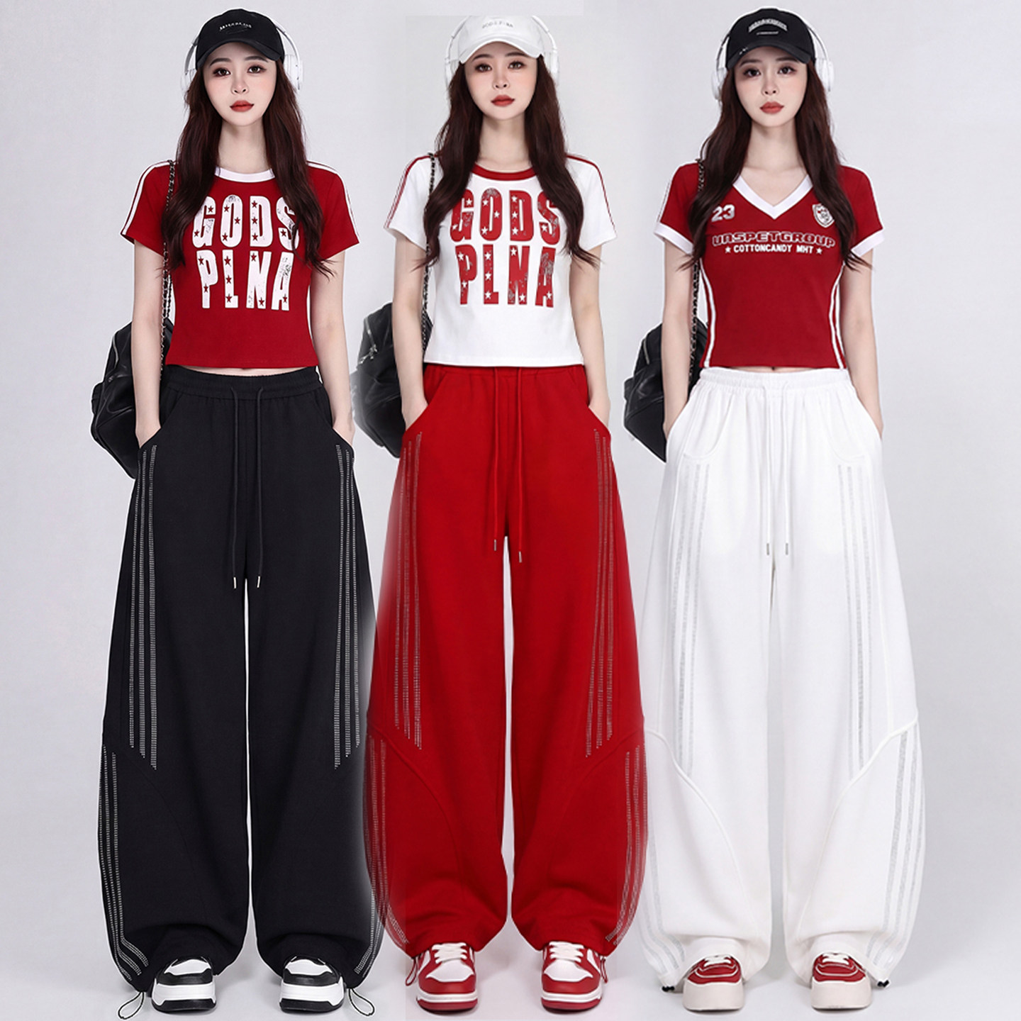 辣妹红色休闲宽松工装裤女jazz爵士跳舞服穿搭春秋hiphop街舞套装