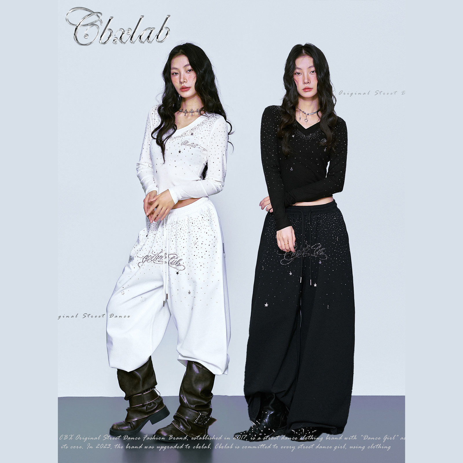 CBXLAB街舞潮牌"千禧碎钻"套装朋克嘻哈运动裤V领性感修身长袖女