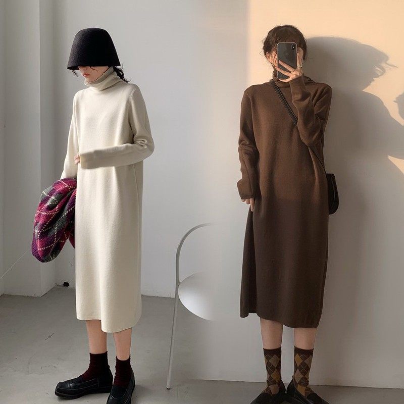 秋冬装半高领中长款加厚羊绒衫女毛衣羊毛针织打底衫胖妹妹连衣裙