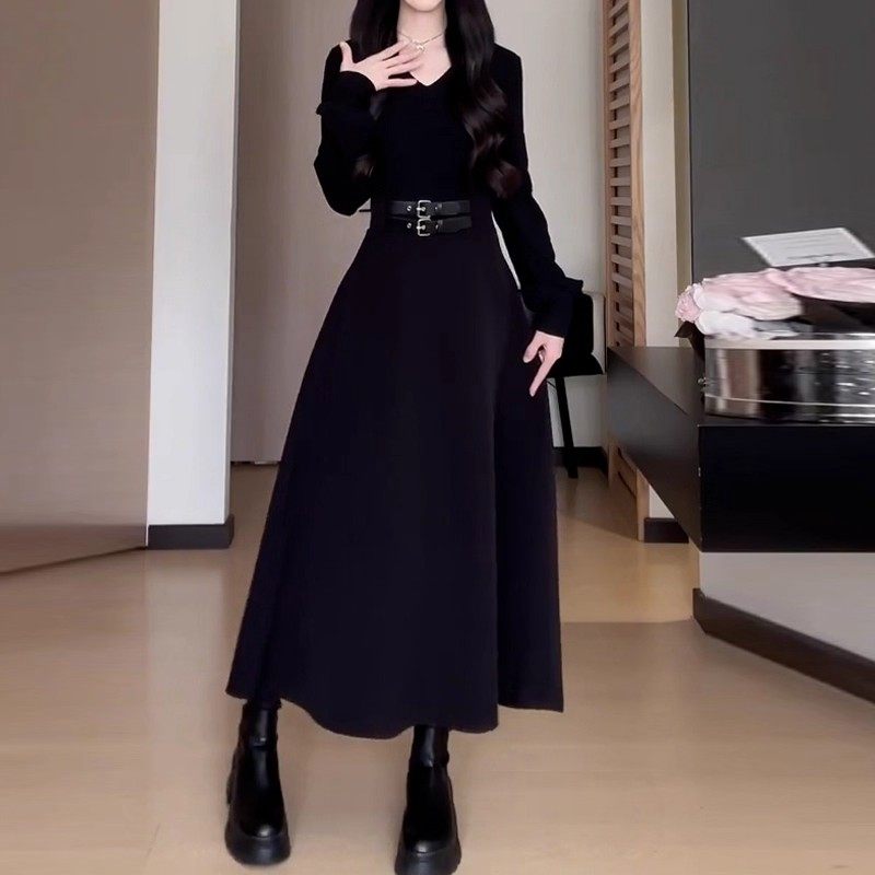 大码胖妹妹法式赫本风V领小黑裙女秋冬打底裙温柔显瘦收腰连衣裙