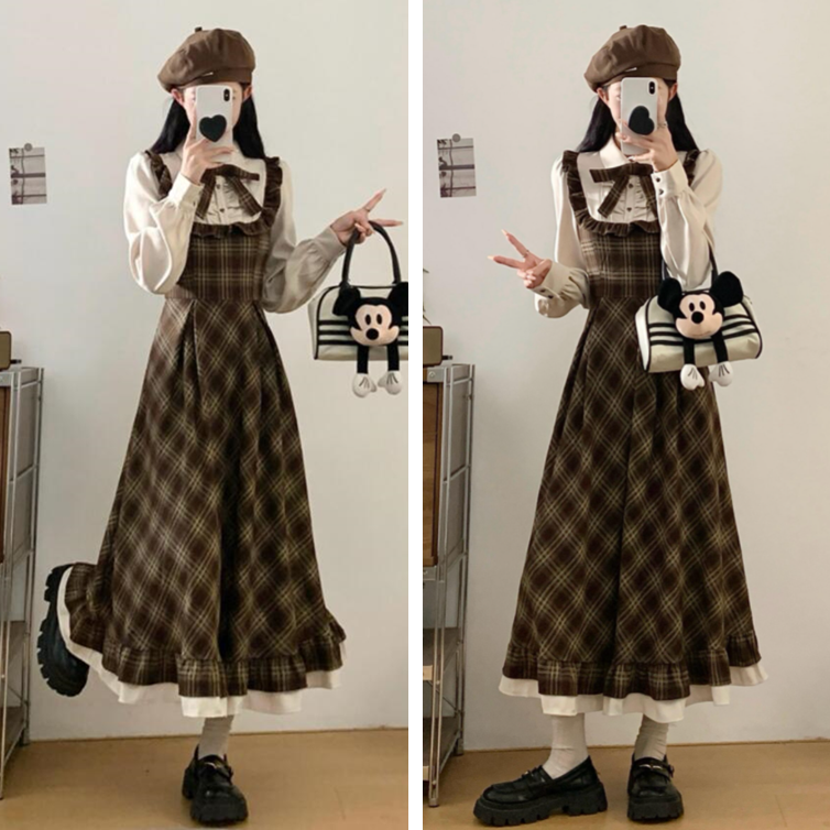 大码学院风格子长袖衬衫连衣裙女秋冬胖妹妹mm甜美气质打底长裙子