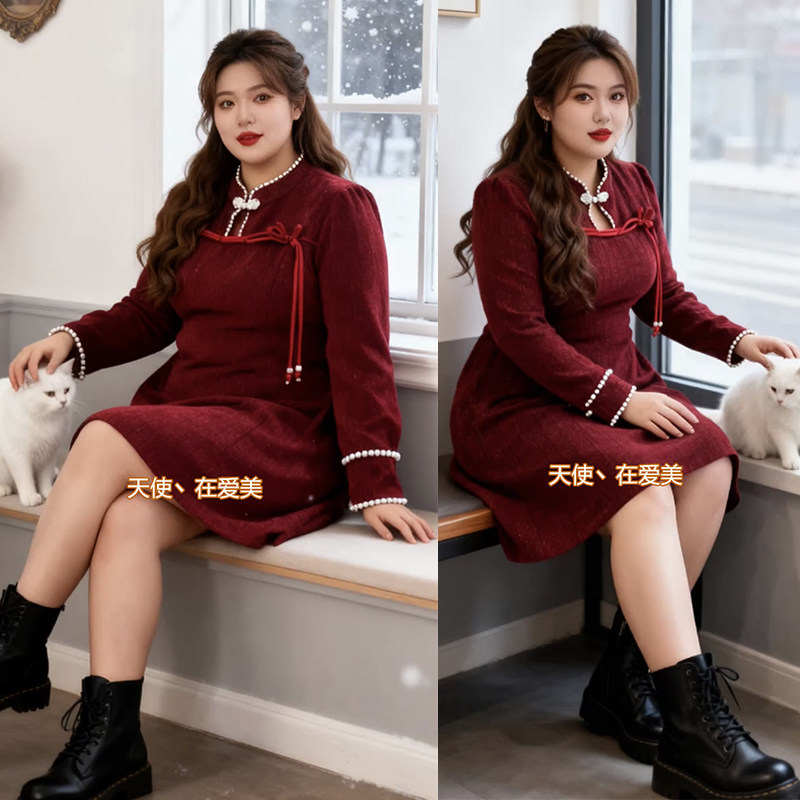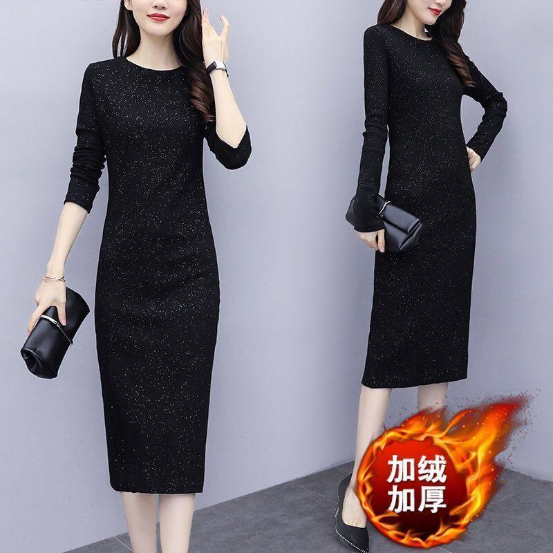 加绒/不加绒 大码女装秋冬打底连衣裙胖妹妹加肥加大烫金后开叉裙