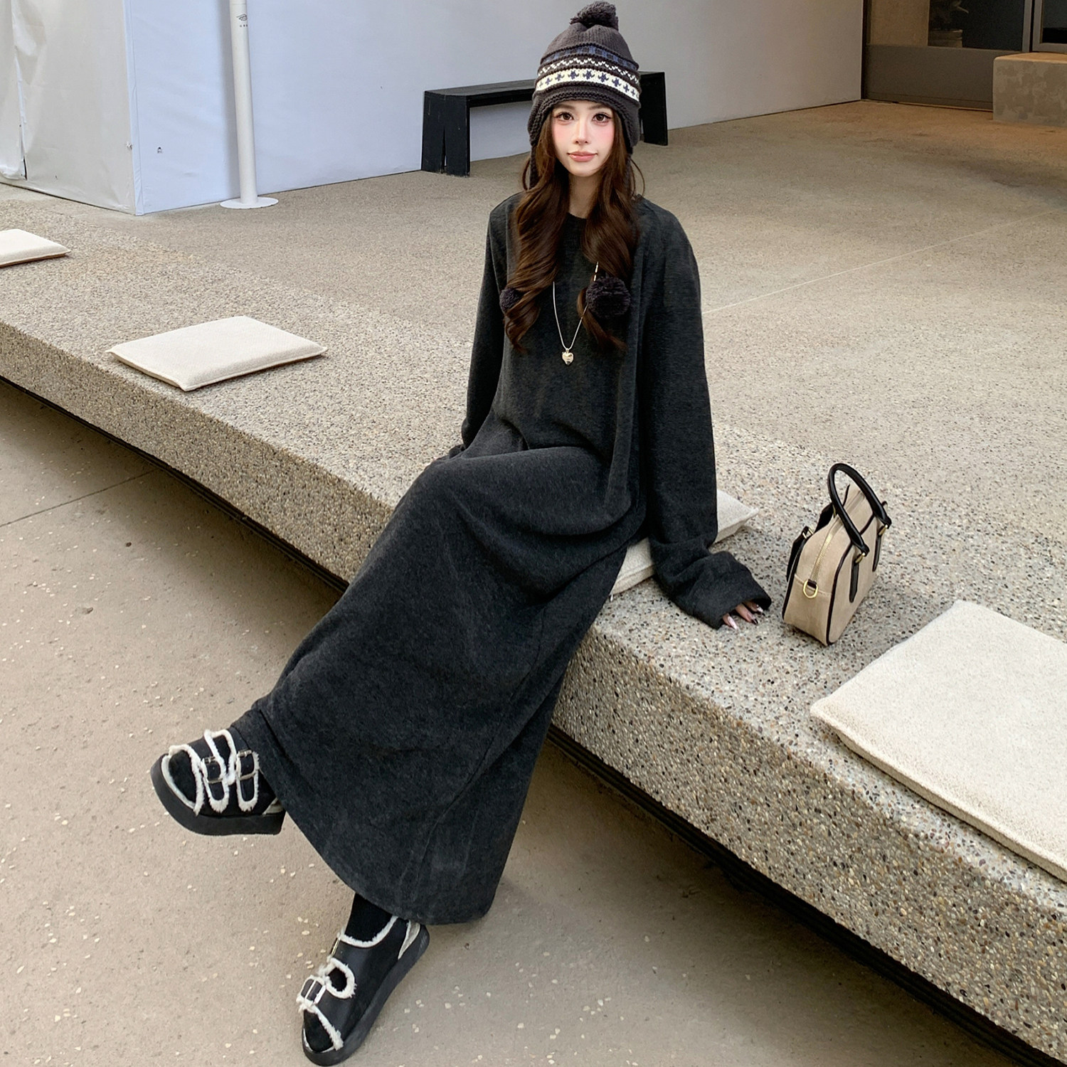 大码慵懒气质宽松长款懒人连衣裙女秋冬季胖妹妹打底保暖抓毛裙子