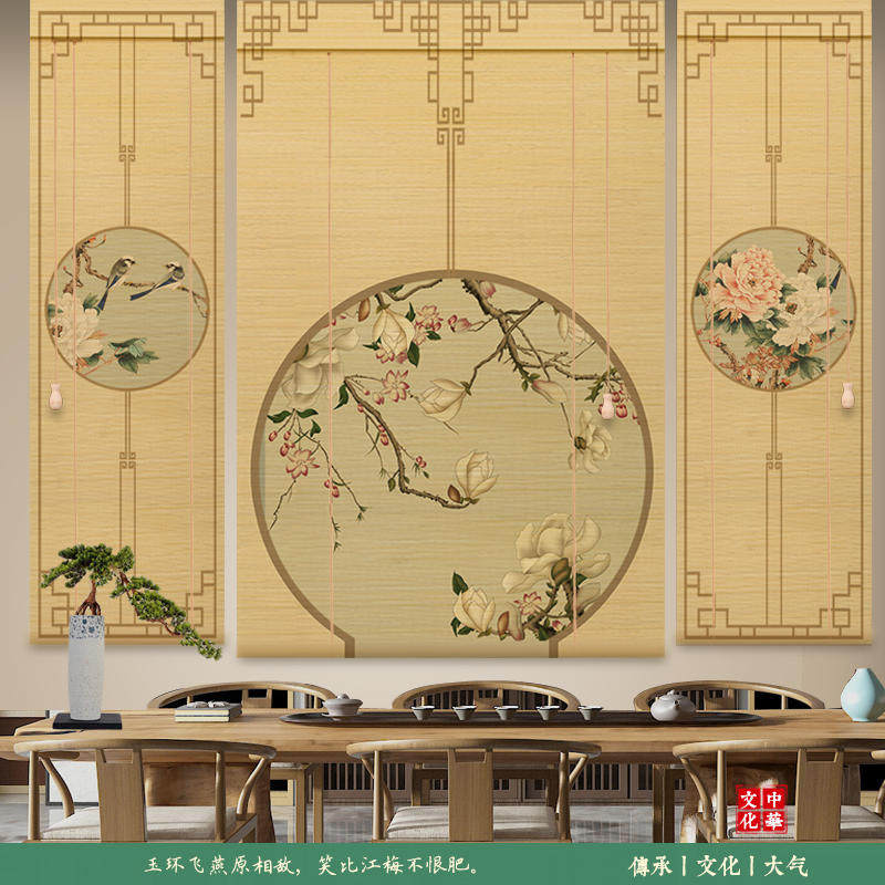 新中式竹帘窗帘玄关隔断卷帘印花挂帘屏风茶道茶室门帘遮光遮阳帘