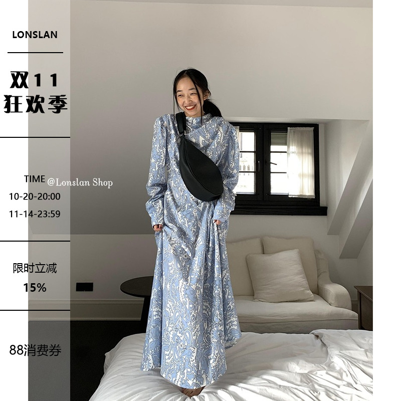 Lonslan 2025自制早春新品慵懒风复古印花中长款碎花连衣裙女清新