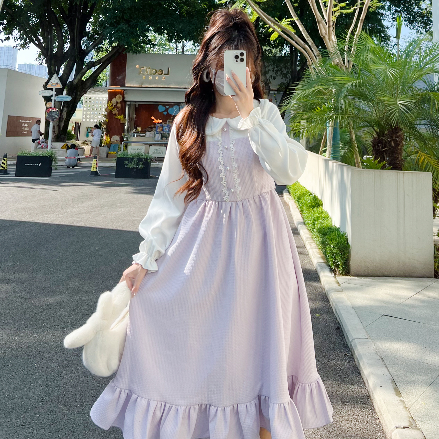 文艺女连衣裙双纱棉秋季新款宽松纯色打底裙风琴褶长款优雅长裙子