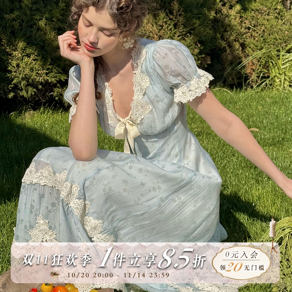 LaceMade 夏天的风 法式田园清新baby蓝长款短袖蕾丝裙通勤连衣裙