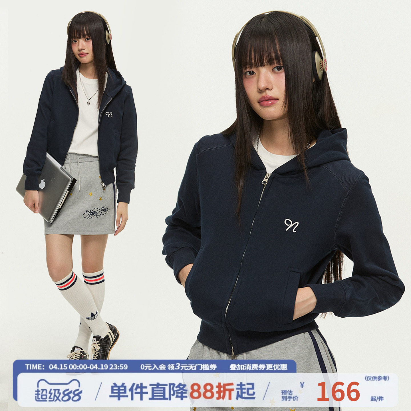 江南先生NewJNXS学院风连帽开衫卫衣春秋短款宽松logo刺绣外套女