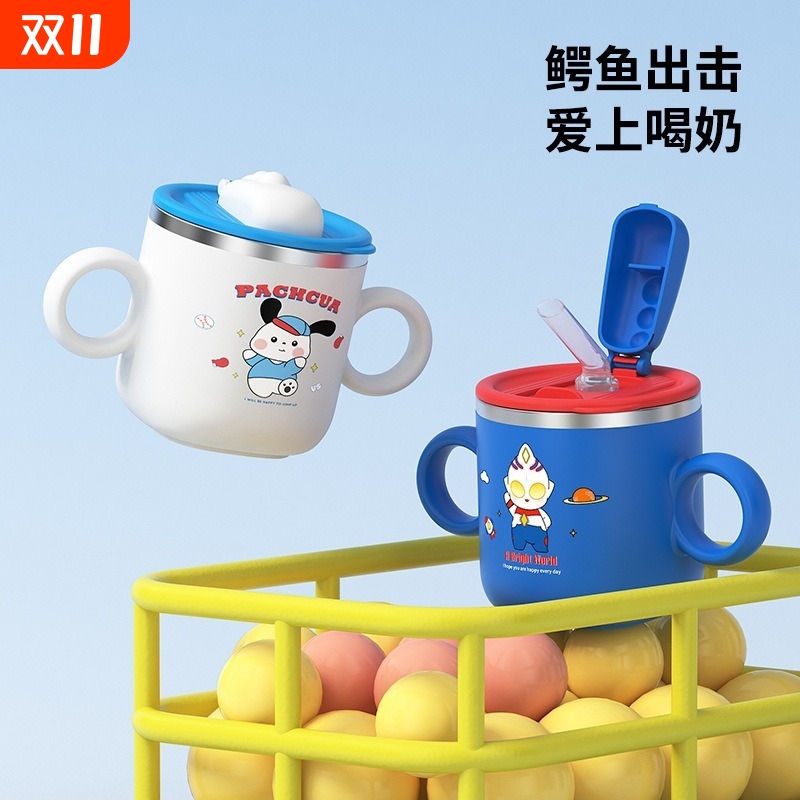 如山儿童保温杯宝宝吸管杯小月龄学饮杯婴幼儿316不锈钢双饮水杯