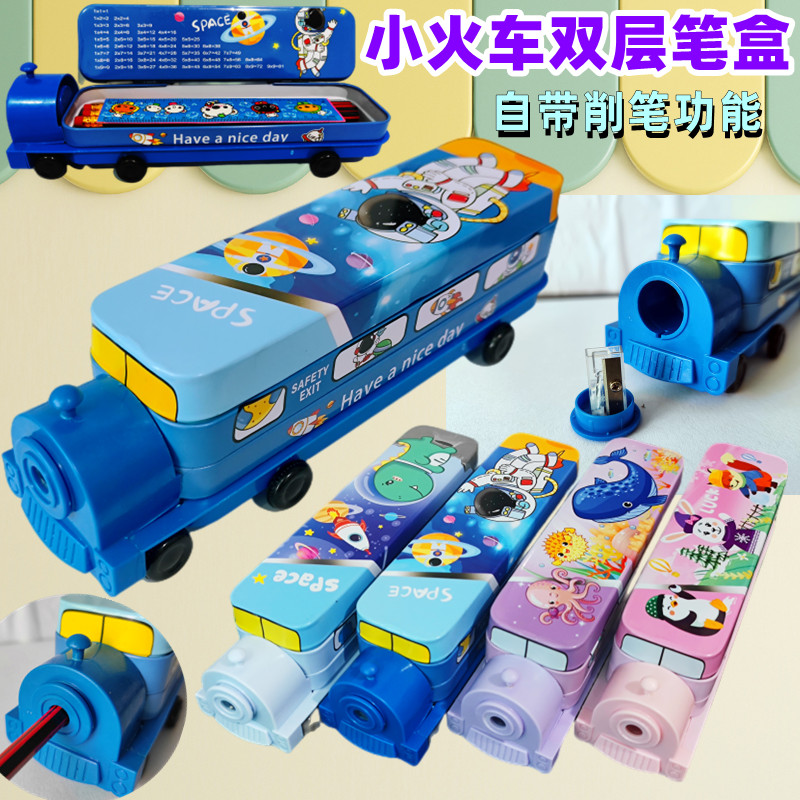 新款双层火车文具盒宇航员多功能铅笔盒自带削笔刀功能男童笔袋幼